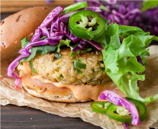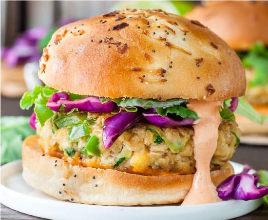 Spicy chickpea veggie burgers with jalapeño and zucchini, topped with a tasty honey-lime slaw and fiery Sriracha mayo. These patties are the perfect veggie alternative for your everyday saucy beef patty and is guaranteed to leave no one wanting at your next burger bash.