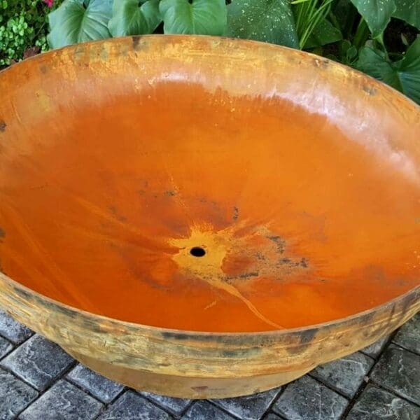 Rusting Patina is a brown, glossy or sheen film on the surface of the steel dish, produced by oxidation over a period of time, resulting from age or polishing. We speed up this process using a chemical and not a pint cover. Should you not wish your dish to rust further you should apply oil to protect the steel from moisture.